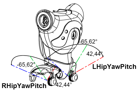 | LHipYawPitch | Left hip joint twist (Y-Z 45°) | -65.62 to 42.44 | -1.145303 to 0.740810 |