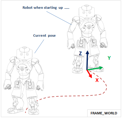 • FRAME_WORLD: this is a fixed origin that is never altered. It is left behind when the robot walks, and will be different in z rotation after the robot has turned. This space is useful for calculations which require an external, absolute frame of reference.