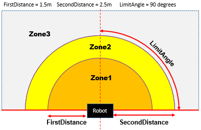 The space in front of the robot is divided in configurable zones. Thus, you can adapt the behavior of the robot depending on the zone a person or a movement is detected in.